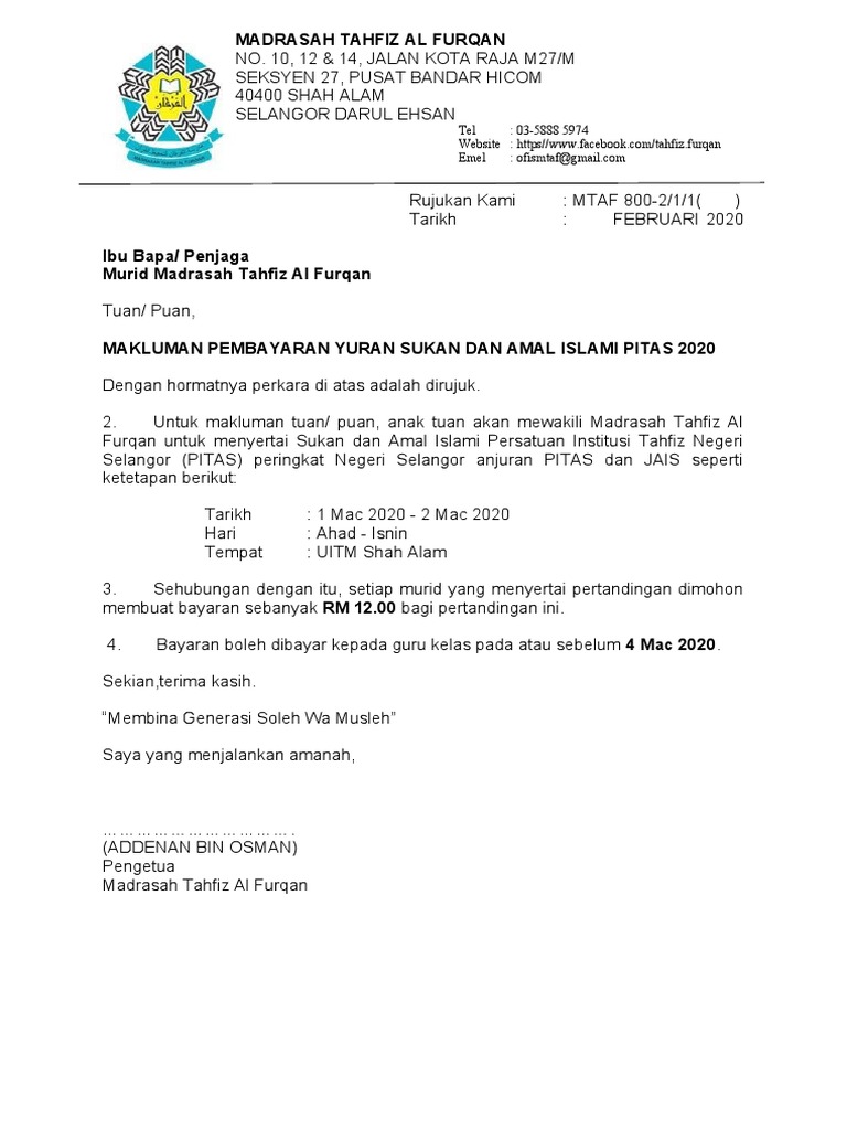 Surat Makluman Bayaran Yuran Pitas Pdf